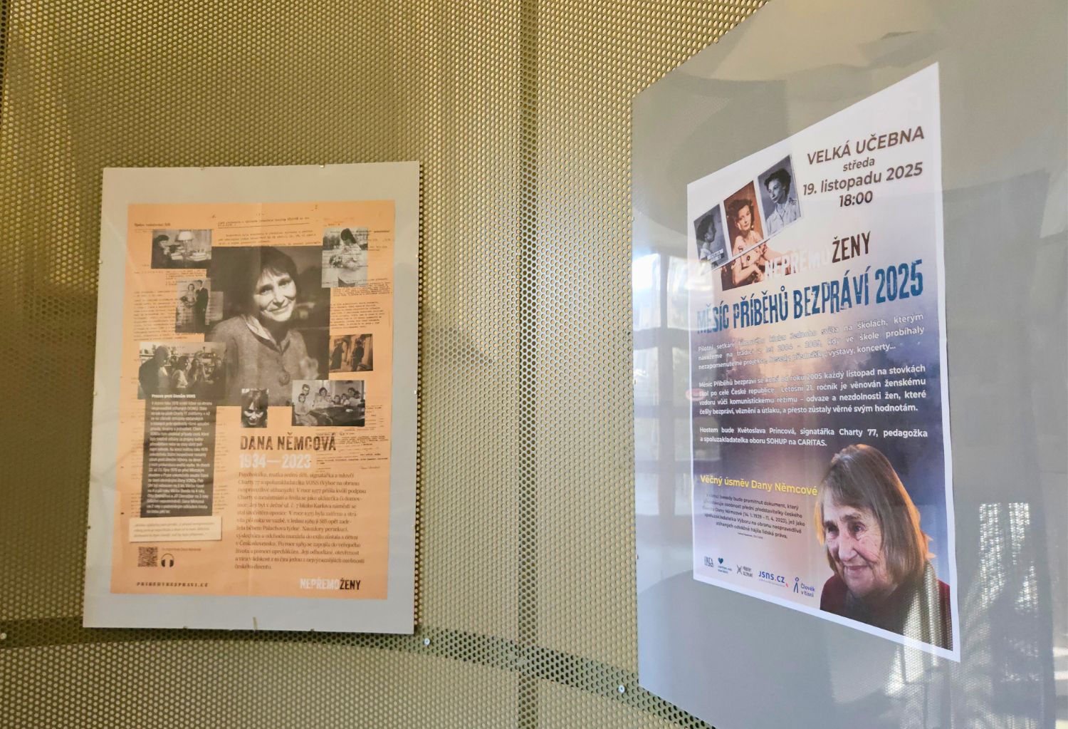 Ve vstupní hale školy si můžete v listopadu prohlédnout výstavu NepřemoŽENY, která představuje sedm příběhů žen statečně vzdorujících komunistickému režimu. Přibližuje jejich odvahu, vytrvalost i osobní oběti – od výslechů a věznění až po každodenní tlak totalitní moci. Každý panel doplňují autentické audiovzpomínky dostupné přes QR kód: osobní svědectví, která boří stereotypy o „ženské slabosti“ a ukazují, kolik podob může mít odvaha.